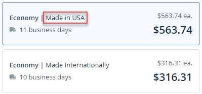 If your project's timeline isn't urgent, our domestic economy tier is a great way to reduce the overall cost. If you want or need your parts made domestically, check the country of origin, as shown in the image below. Economy orders may be eligible for free ground shipping.